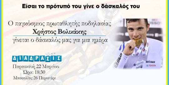 ThinkPlus2020-04-21T10:25:18+00:00Είσαι το πρότυπό του, γίνε ο δάσκαλός του Με μεγάλα χαμόγελα και γεμάτα ανυπομονησία περίμεναν τα παιδιά στον χώρο του Διάδρασης, στο Περιστέρι, τον Παγκόσμιο πρωταθλητή ποδηλασίας Χρήστο Βολικάκη. Ο Παγκόσμιος πρωταθλητής ποδηλασίας, Χρήστος Βολικάκης, που έχει φέτος σαρώσει τα μετάλλια και έχει κατακτήσει την κορυφή του κόσμου θα βρεθεί το απόγευμα της
